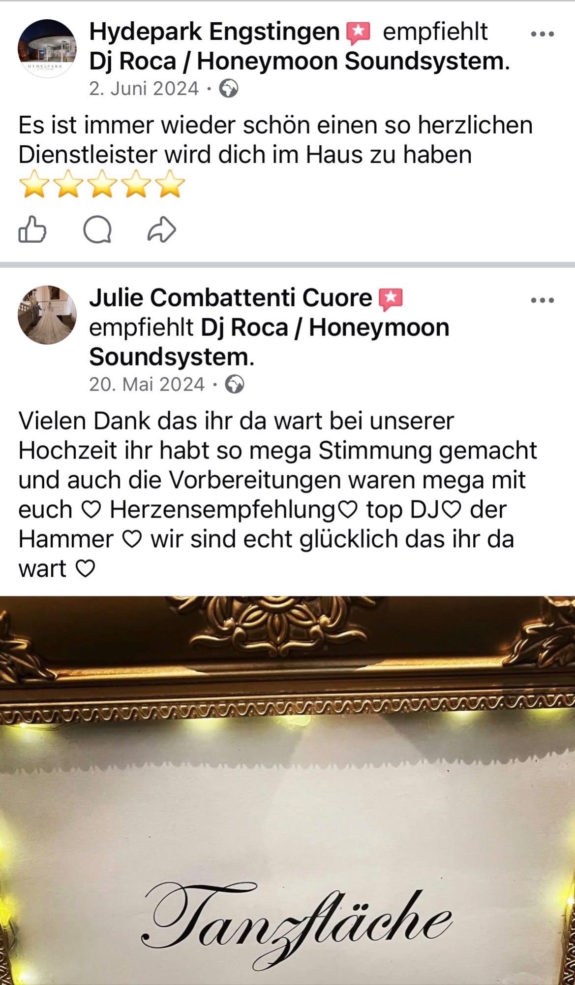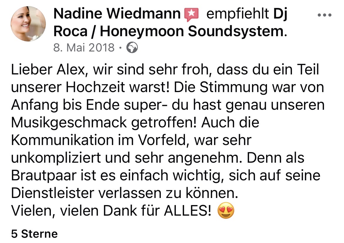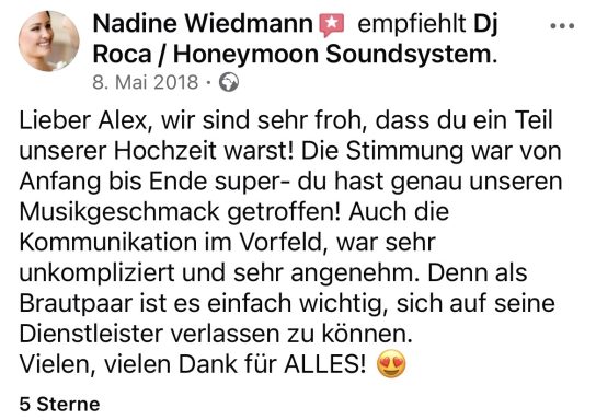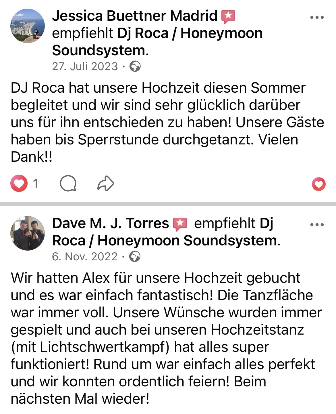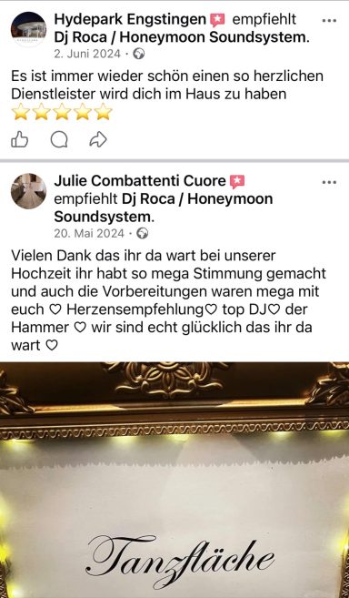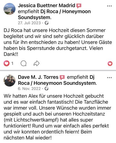 - "DJ Roca hat unsere Hochzeit zu einem unvergesslichen Erlebnis gemacht! Die Musikauswahl war perfekt und er war sehr professionell!"