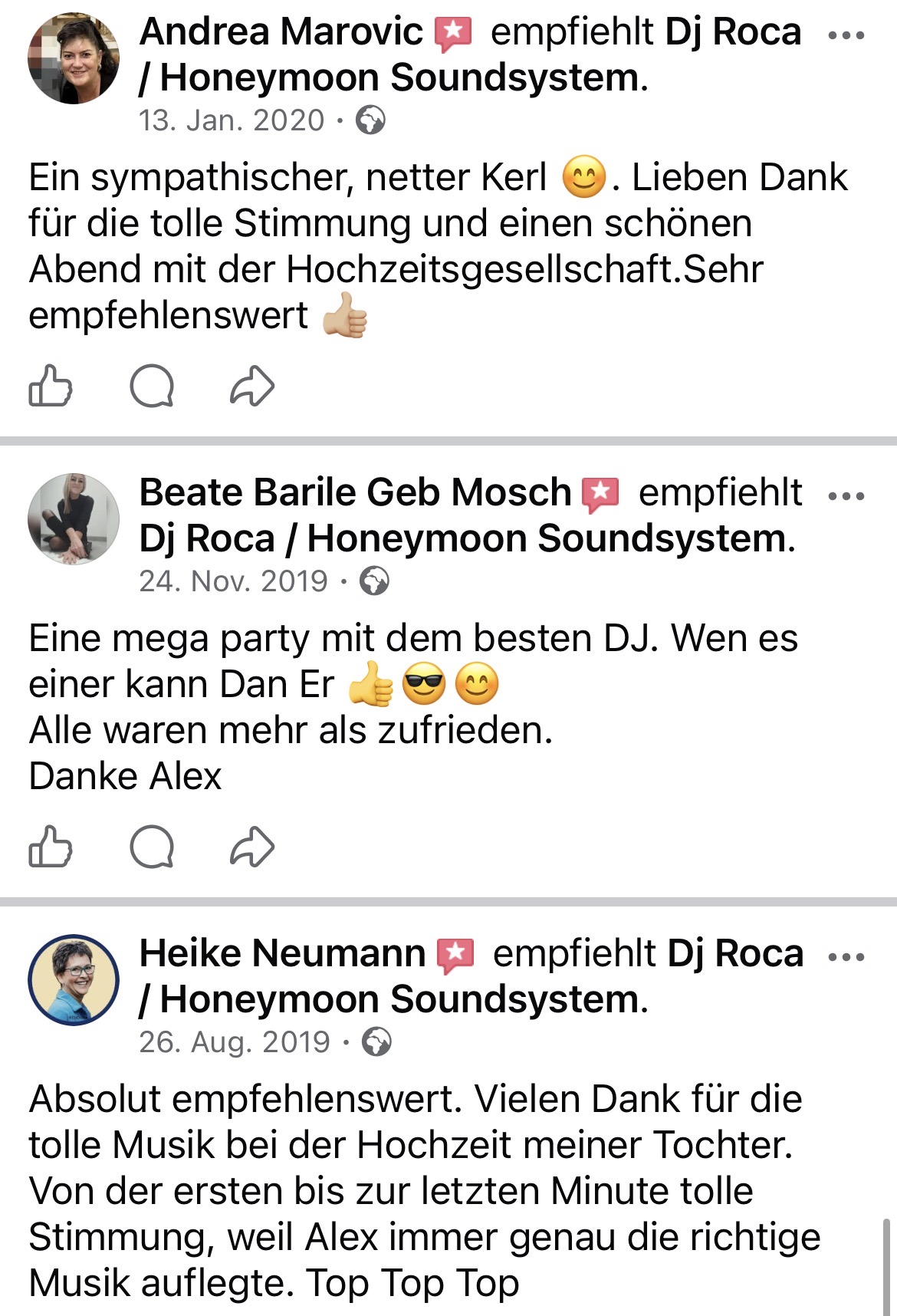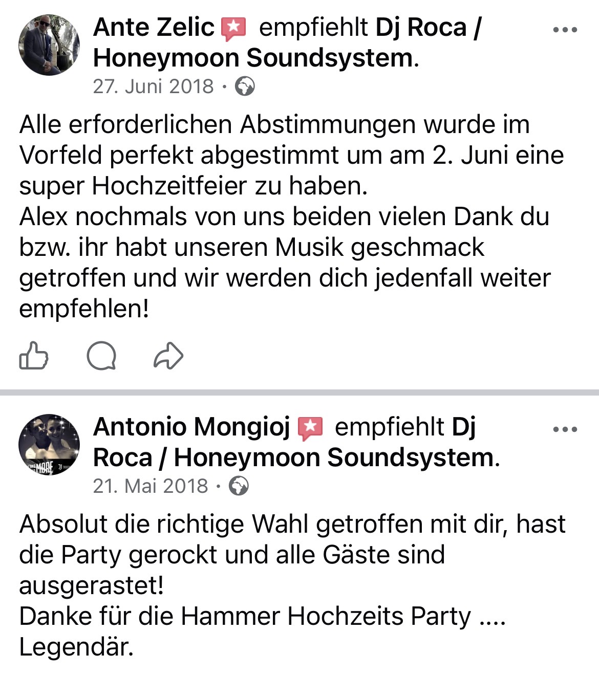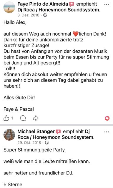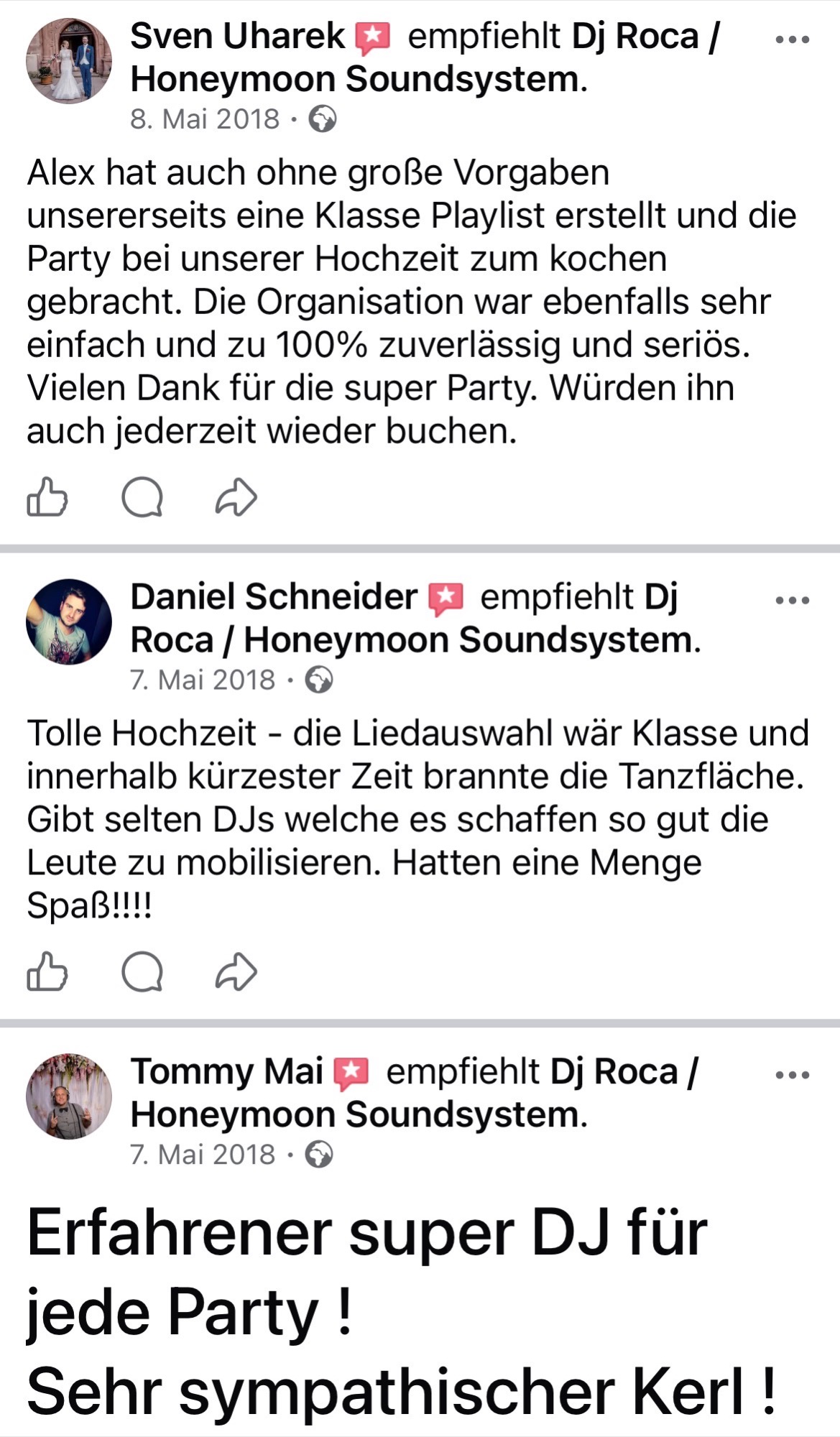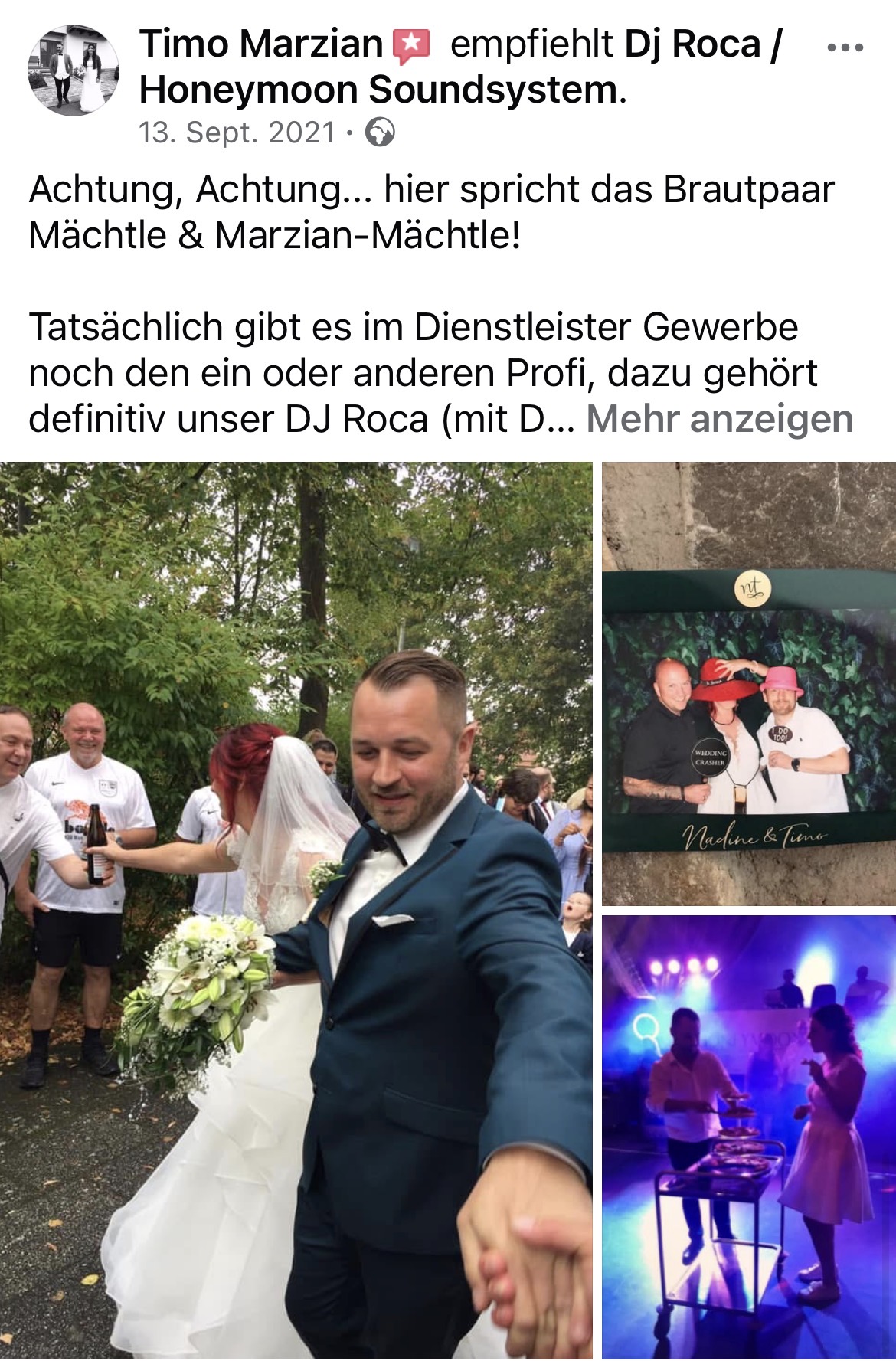 - "DJ Roca hat unsere Hochzeit zu einem unvergesslichen Erlebnis gemacht! Die Musikauswahl war perfekt und er war sehr professionell!"
