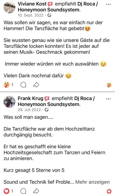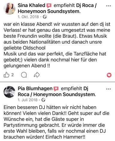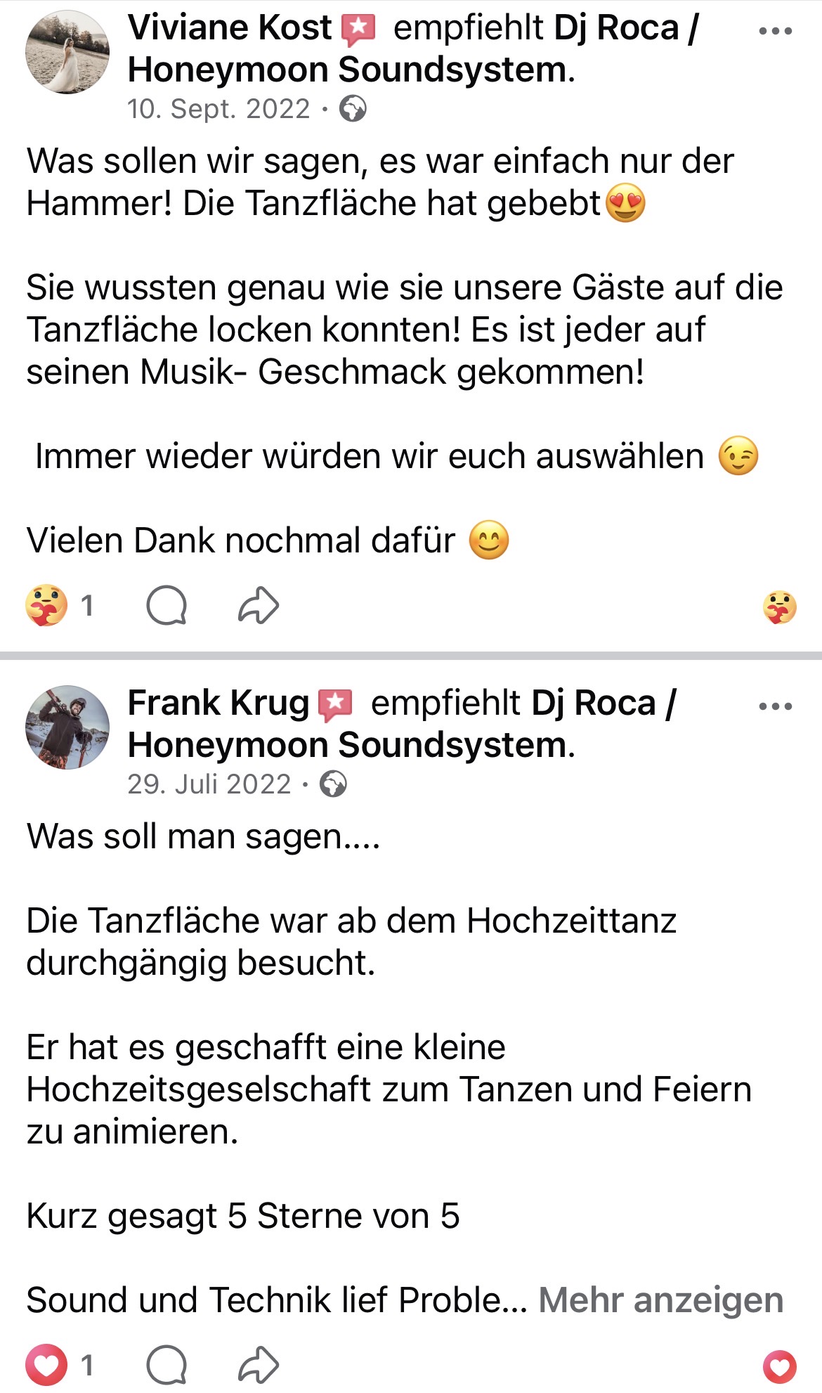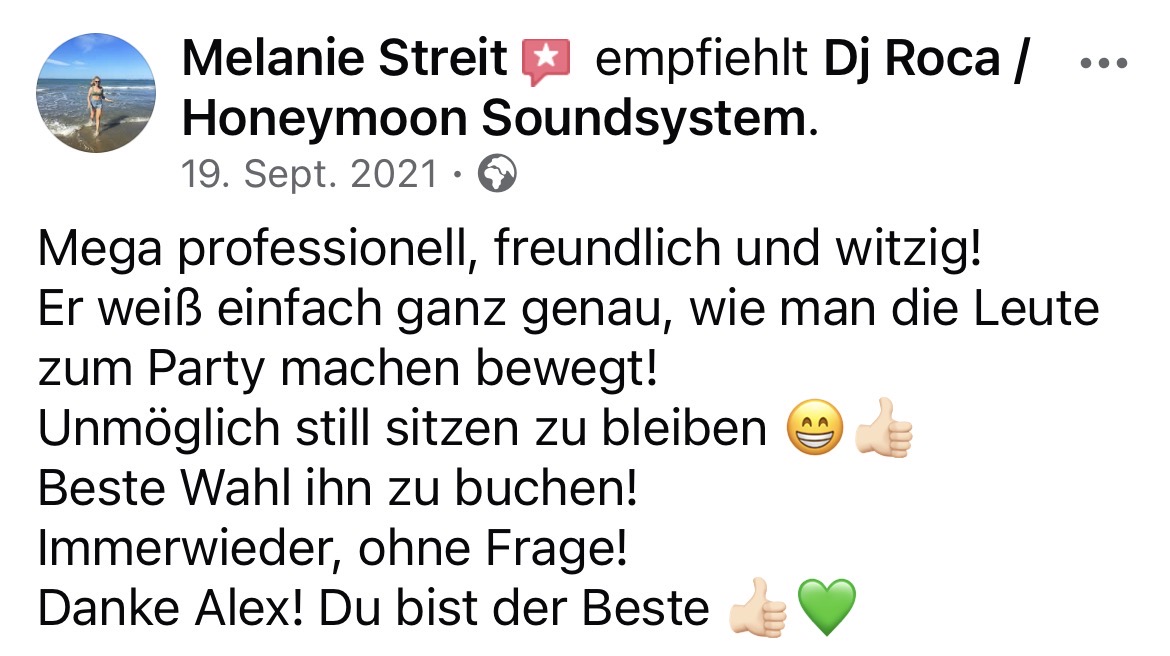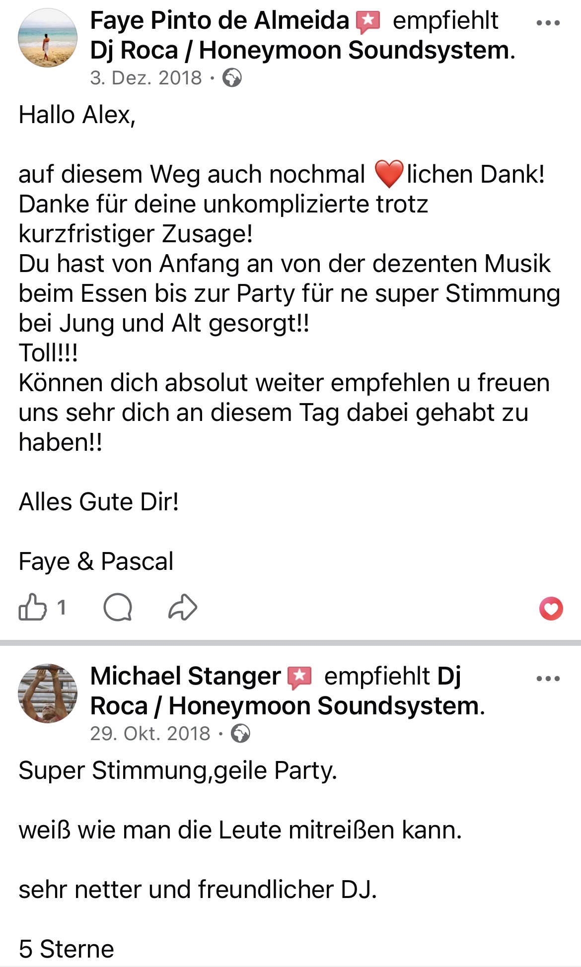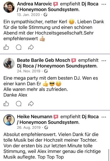 - "DJ Roca hat unsere Hochzeit zu einem unvergesslichen Erlebnis gemacht! Die Musikauswahl war perfekt und er war sehr professionell!"
