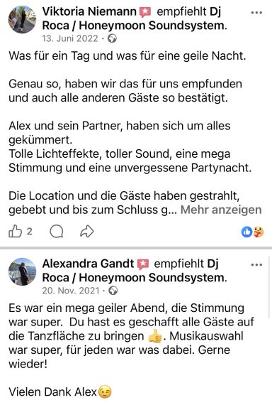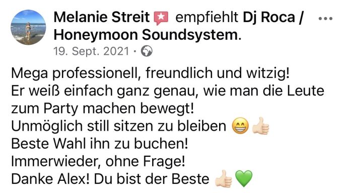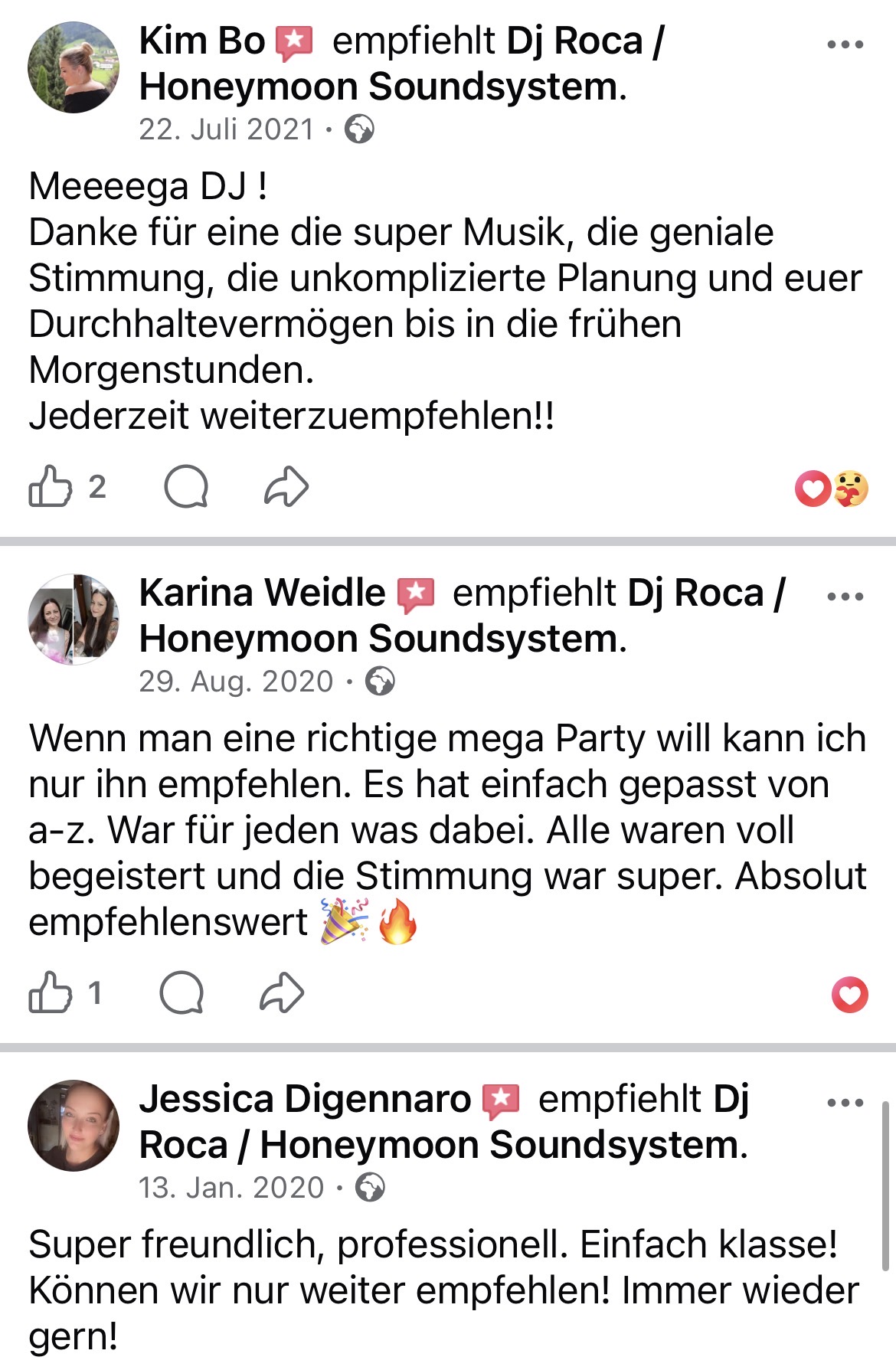 - Markus G. - "Die Party war der Knaller! DJ Roca hat unsere Erwartungen übertroffen und alle zum Tanzen gebracht!"